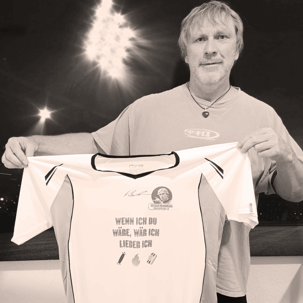 Fußball–Legende und einem der letzten, klassischen Straßenfußballer, Ansgar Brinkmann eine kleine Auswahl an Shirts und Hoodies mit verschiedenen Sprüchen aus seiner Fußballerzeit an.